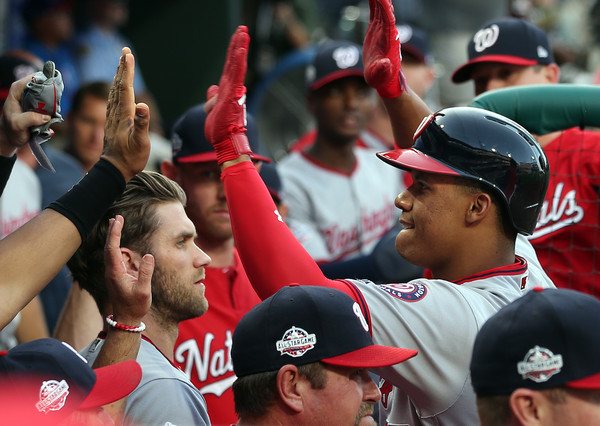 Juan Soto #22 of the Washington Nationals in congratulated after hitting a two-run home run during the first inning of a game against the Philadelphia Phillies at Citizens Bank Park on June 29, 2018 in Philadelphia, Pennsylvania. (June 28, 2018 – Source: Rich Schultz/Getty Images North America)