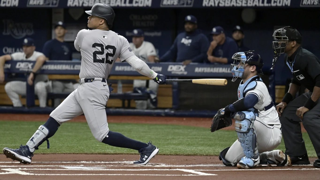 En St. Petersburg, el jardinero izquierdo de los Yankees de Nueva York bateó de 3-2 que fueron su cuadrangular número 22 y su doblete 14 de la temporada en la derrota de su equipo con marcador de 5-4 ante los Rays de Tampa Bay.
