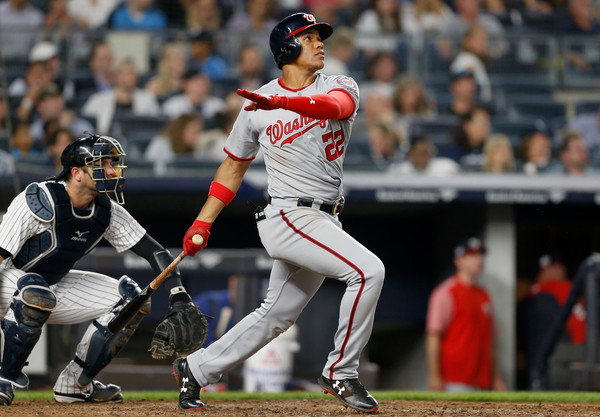 Juan Soto #22 of the Washington Nationals follows through on a seventh inning home run against the New York Yankees at Yankee Stadium on June 13, 2018 in the Bronx borough of New York City.