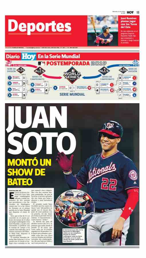 HOUSTON, Texas – Juan José Soto ha maravillado a todos con su impresionante bateo desde que subió a las Grandes Ligas en mayo del 2018. El martes en el Juego 1 de la Serie Mundial, el toletero dominicano de los Nacionales volvió a dar de qué hablar con un jonrón frente a Gerrit Cole de los Astros en el cuarto inning del partido.