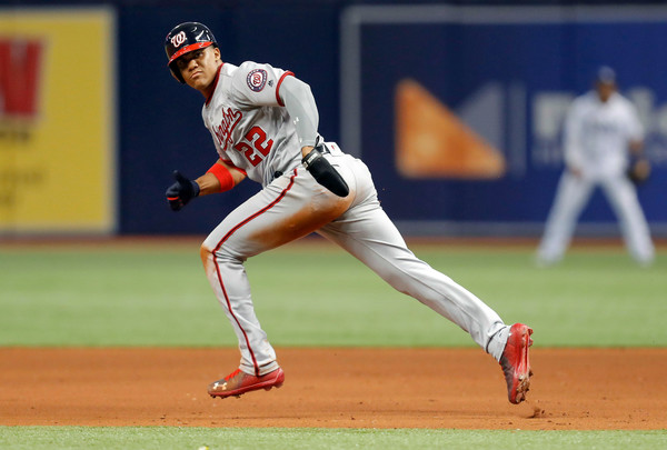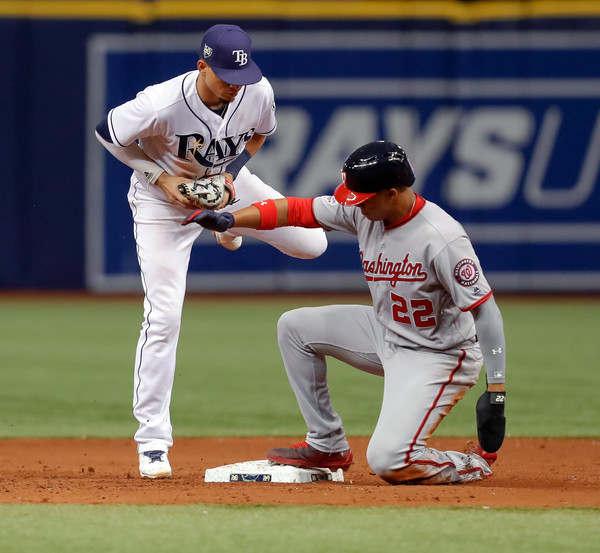 Juan Soto #22 of the Washington Nationals attempts to steal second base in the ninth inning of a baseball game against the Tampa Bay Rays at Tropicana Field on June 25, 2018 in St. Petersburg, Florida.(June 25, 2018 – Source: Mike Carlson/Getty Images North America)