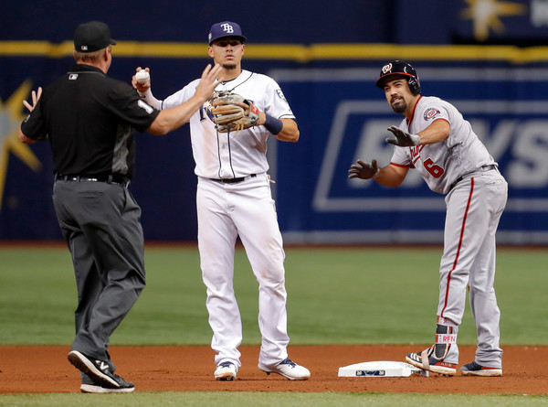 Anthony Rendon #6 of the Washington Nationals, right calls time out after his double in the seventh inning of a baseball game as Willy Adames #1 of the Tampa Bay Rays reacts at Tropicana Field on June 25, 2018 in St. Petersburg, Florida.(June 25, 2018 – Source: Mike Carlson/Getty Images North America)