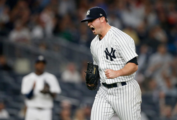 Zach Britton #53 of the New York Yankees reacts after a ninth inning game ending double play against the Boston Red Sox at Yankee Stadium on September 18, 2018 in the Bronx borough of New York City.(Sept. 17, 2018 – Source: Jim McIsaac/Getty Images North America)