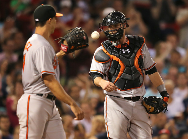 Matt Wieters #32 of the Baltimore Orioles tosses the ball to Ubaldo Jimenez #31 of the Baltimore Orioles after a Boston Red Sox run scored in the fourth inning at Fenway Park on June 23, 2015 in Boston, Massachusetts.