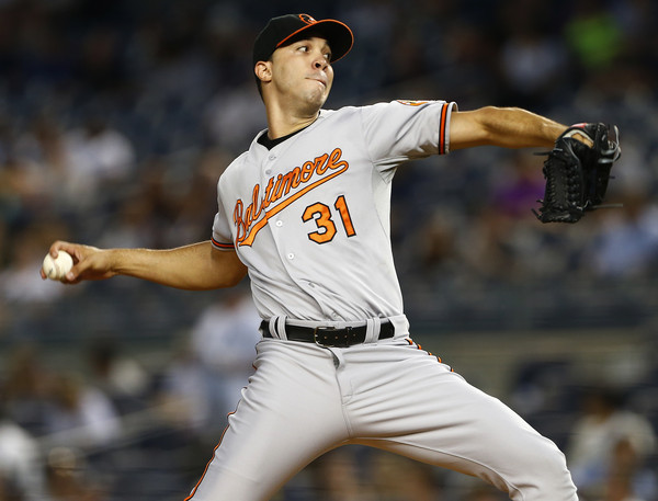 Pitcher Ubaldo Jimenez #31 of the Baltimore Orioles delivers a pitch in the first inning against the New York Yankees during a MLB baseball game at Yankee Stadium on September 9, 2015 in the Bronx borough of New York City.