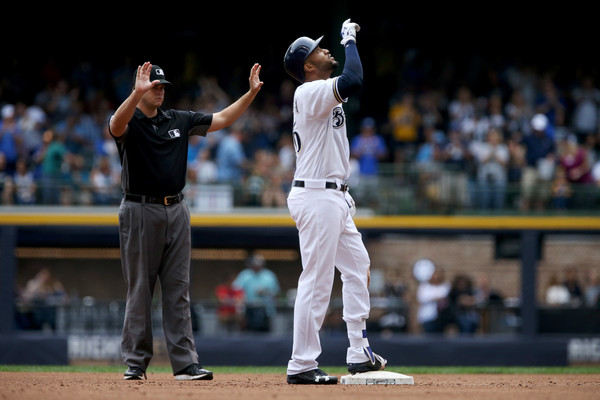 Domingo Santana #16 of the Milwaukee Brewers celebrates after hitting a double in the fourth inning against the Miami Marlins at Miller Park on September 17, 2017 in Milwaukee, Wisconsin.