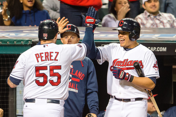 Roberto Perez #55 celebrates with Giovanny Urshela #39 of the Cleveland Indians after Perez hit a two run hoe run during the seventh inning against the Minnesota Twins at Progressive Field on October 1, 2015 in Cleveland, Ohio during game two of a doubleheader. (Sept. 30, 2015 – Source: Jason Miller/Getty Images North America)