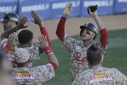 Félix Pérez, del equipo venezolano Tigres de Aragua, celebra con sus compañeros durante la semifinal de la Serie del Caribe contra los Cangrejeros de Santurce, de Puerto Rico, el sábado 6 de febrero de 2016, en Santo Domingo (AP Foto/Roberto Guzman)