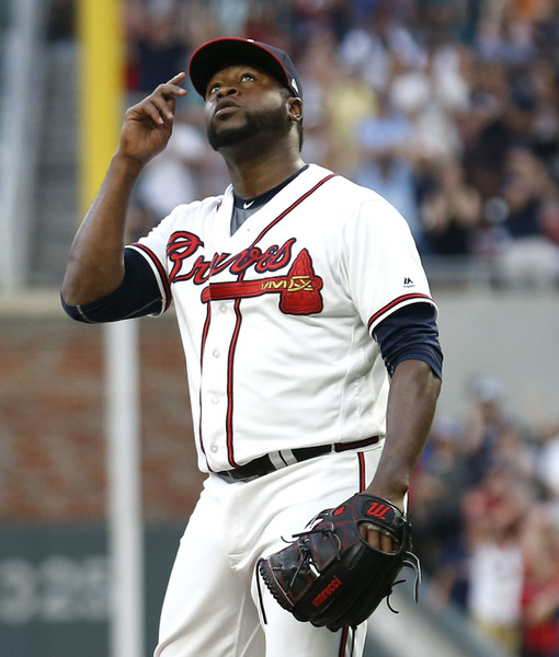 Closer Arodys Vizcaino #38 of the Atlanta Braves gestures to the sky after thegame against San Diego Padres at SunTrust Park on June 16, 2018 in Atlanta, Georgia. (June 15, 2018 – Source: Mike Zarrilli/Getty Images North America)