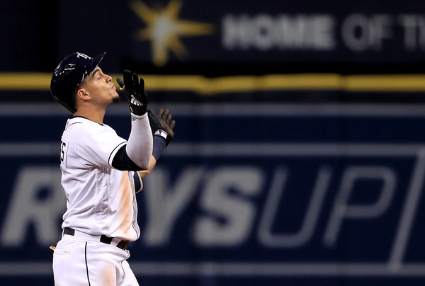 Willy Adames #1 of the Tampa Bay Rays mreacts to a double in the eighth inning during a game against the Houston Astros at Tropicana Field on June 28, 2018 in St Petersburg, Florida. (June 27, 2018 – Source: Mike Ehrmann/Getty Images North America)