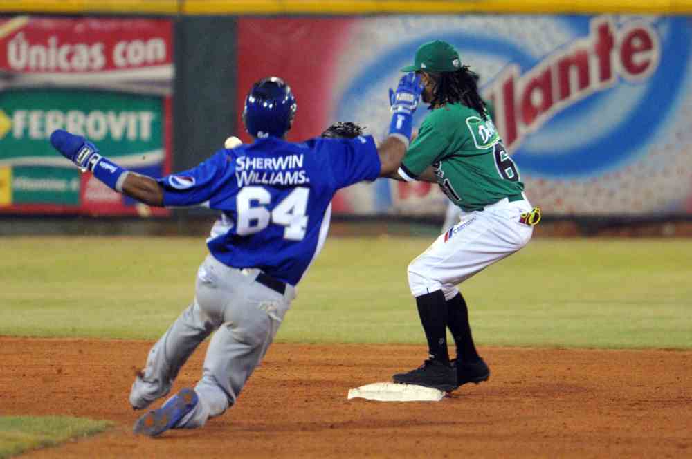 Emilio Bonifacio, del Licey , se barre en la intermedia, mientras que Michael Martínez, de las Estrellas, espera el disparo para completar la jugada